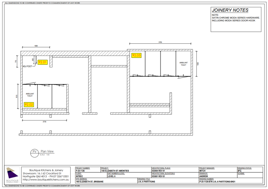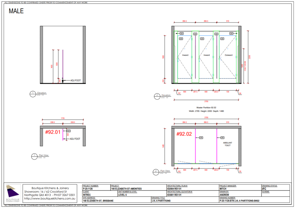 Recent toilet partition projects include: Bunnings Oxley (CIP Constructions), 167 Eagle St selected levels amenities upgrade (McCormack), 140 St Amenities Upgrade (Intrec)